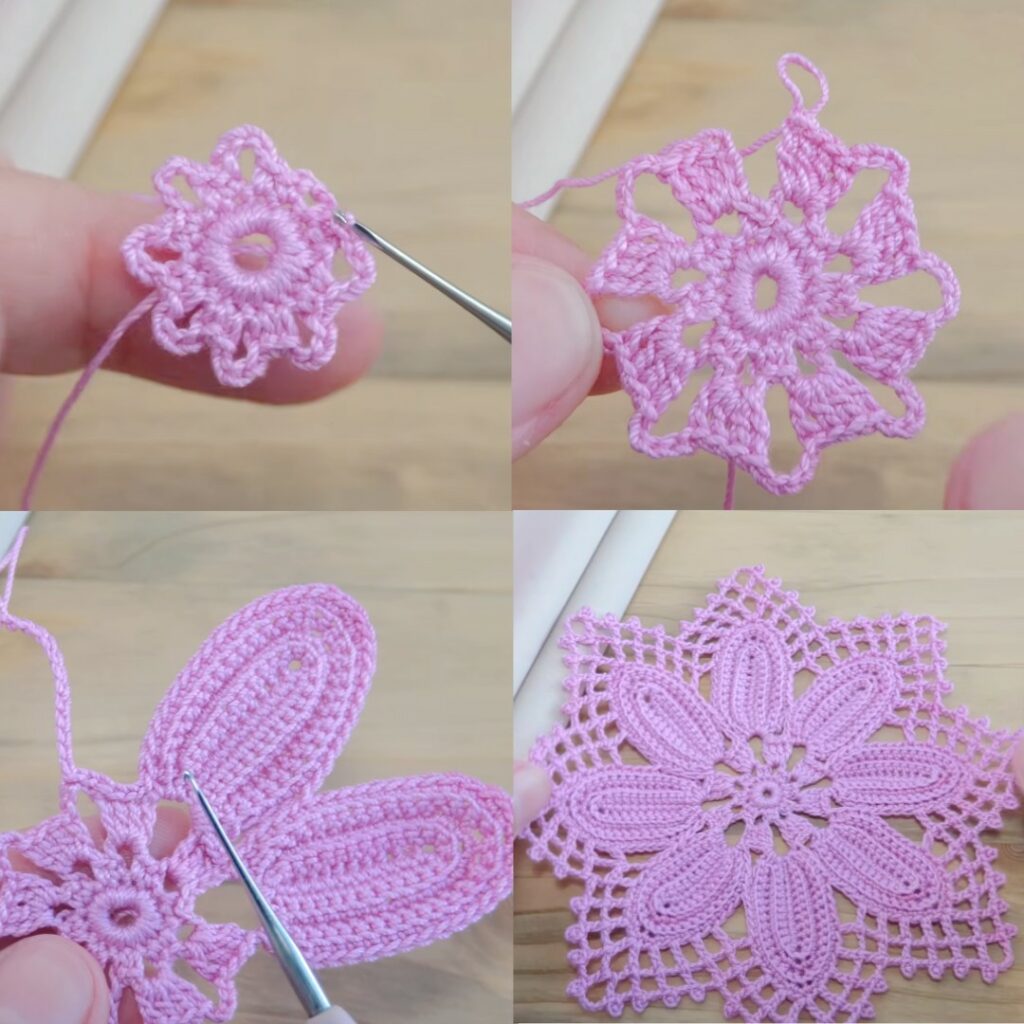 Best to attach motifs during their final round (Round 6) so seams are neat and no sewing is needed.
