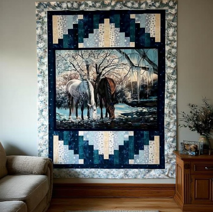 Lovely quilt — warm, wintry panel with crisp log-cabin companions and a soft floral outer frame. Below is a full, step-by-step text tutorial that will let you recreate this exact look. I chose convenient, common block sizes so the math is simple and the sewing flows well. Read through once, then follow each step as you work.