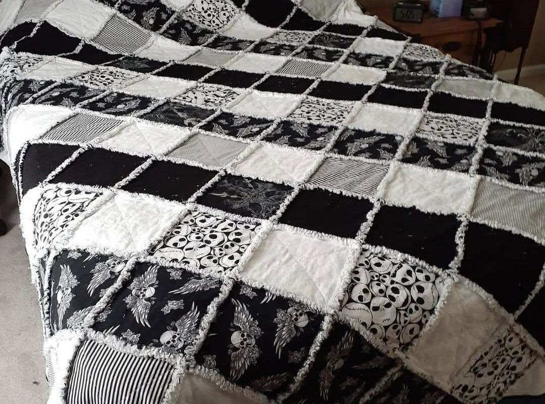 - Assorted quilting cottons in black + black prints + white/cream prints (mix of solids, stripes, skulls, florals as in photo). Aim for strong contrast.