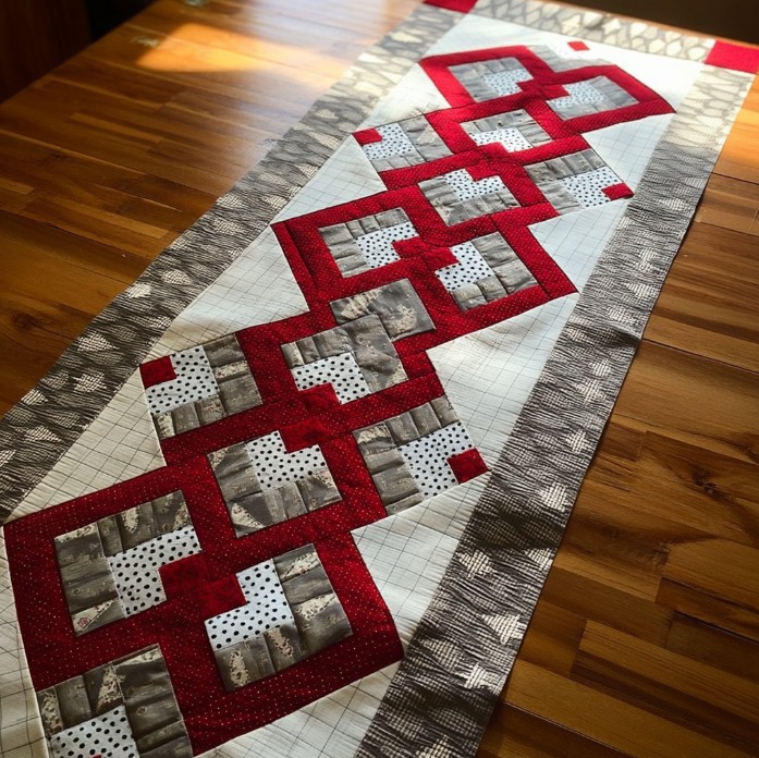 - Each “link” block is a 10″ finished square made from: a 4″ finished center square, a 1″ finished inner log ring (scrappy greys), and a 2″ finished outer red frame. That yields 4 + 2×1 + 2×2 = 10″ finished side.