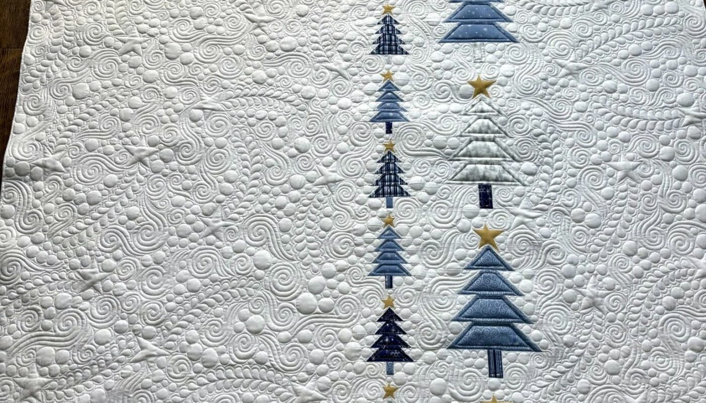 - Design: two vertical columns of stacked, stylized applique trees (small → large), stars above each tree, set on a wide white background heavily quilted with swirls and pebbles.